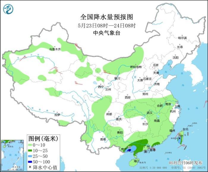 5月22日08時至23日08時,江南中南部、華南大部、臺灣島大部等地部分地區(qū)有中到大雨,其中,廣東中南部、臺灣島北部等地部分地區(qū)有暴雨(50~70毫米)。新疆南疆盆地和東部、江西中部、廣西東北部等地部分地區(qū)有4~6級風(fēng)。東海大部海域、臺灣海峽、臺灣以東洋面將有6~7級、陣風(fēng)8~9級的風(fēng)。