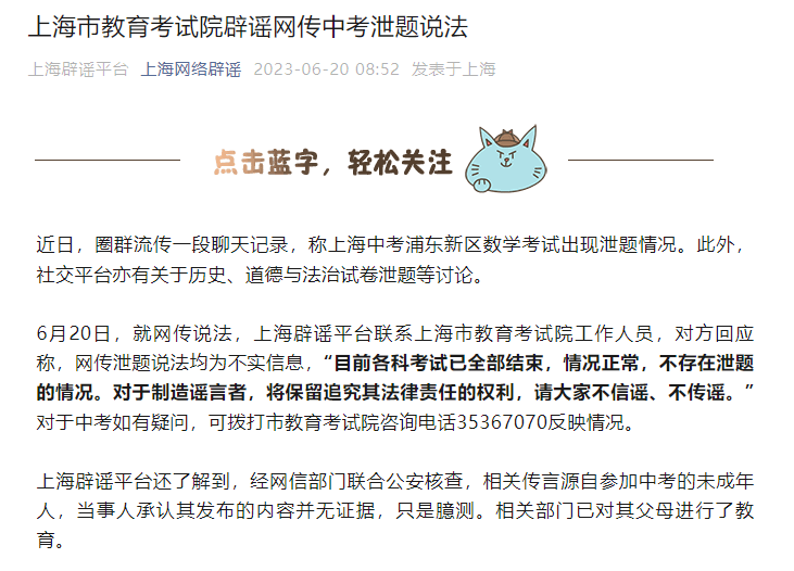 上海市教育考試院辟謠網(wǎng)傳中考泄題說法