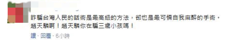 也有臺(tái)灣網(wǎng)友評(píng)論表示“果然是綠色邏輯思維,沒(méi)有最勇敢,只有最無(wú)知!”“趙天麟是在說(shuō)相聲嗎?真愛鬼扯!”“詐騙臺(tái)灣人民的話術(shù)是最高級(jí)的方法,卻也是最可憐自我麻醉的手術(shù)!趙天麟啊!趙天麟你在騙三歲小孩嗎?”