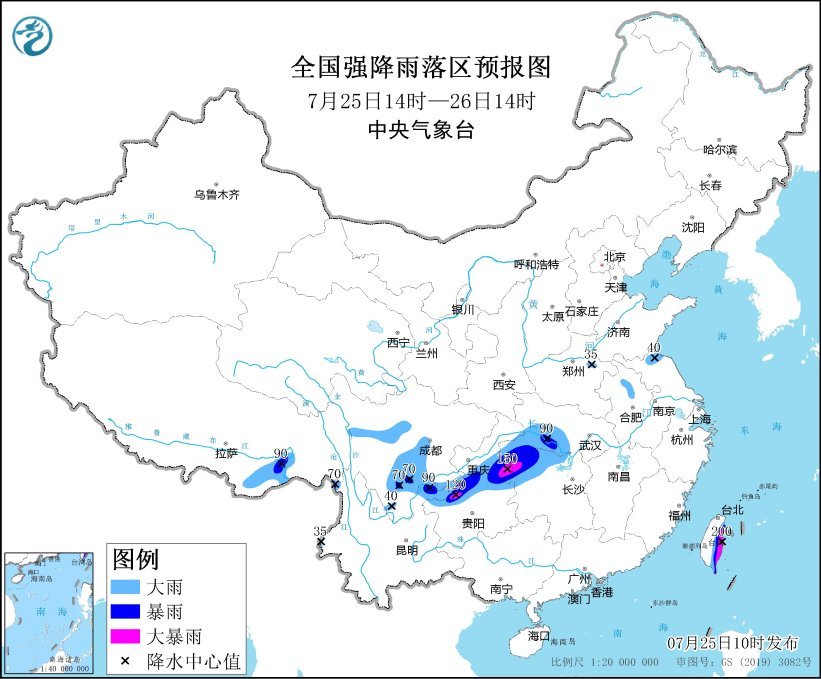 預(yù)計,7月25日14時至26日14時,西藏東南部、云南西部和東北部、四川西部和南部、貴州北部、重慶東部、湖北西南部、湖南西北部以及臺灣島東部等地有大到暴雨,其中,貴州西北部、重慶東南部、湖南西北部和臺灣島東部等地的部分地區(qū)有大暴雨(100~200毫米);上述部分地區(qū)伴有短時強降水(最大小時降雨量20~50毫米,局地可超過80毫米),局地有雷暴大風(fēng)等強對流天氣。