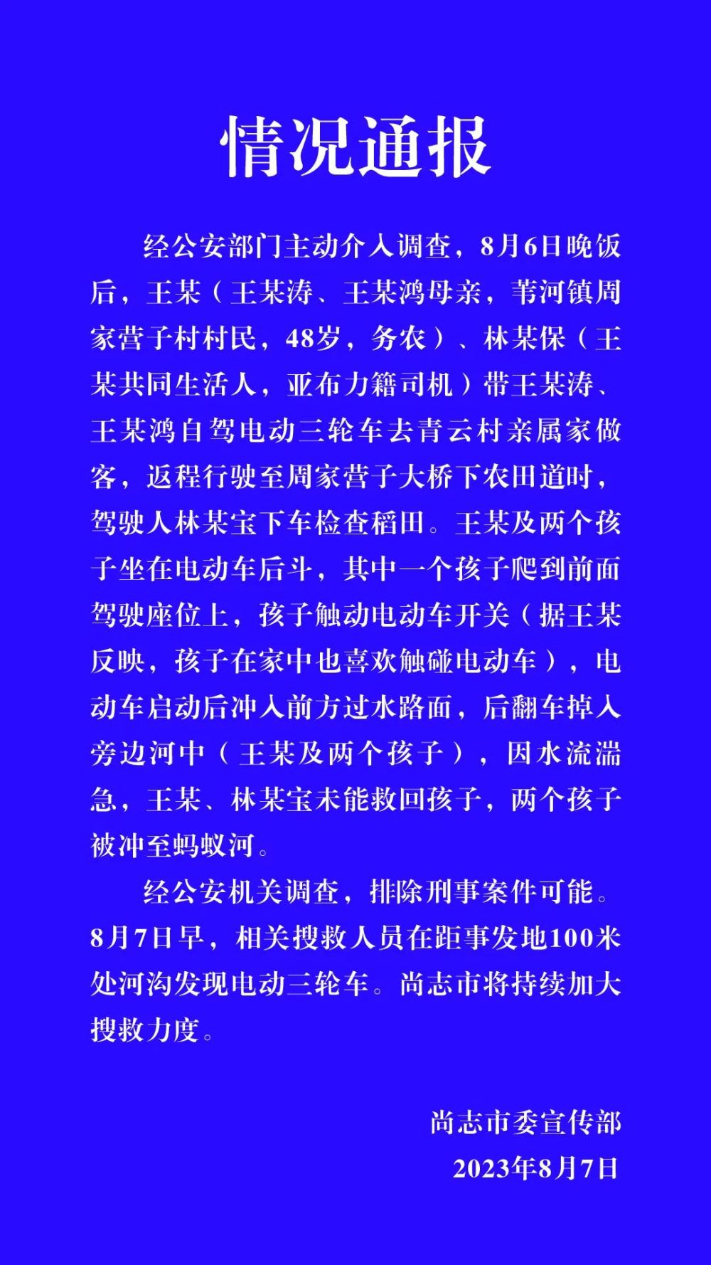 中新網(wǎng)8月8日電 據(jù)尚志市委宣傳部微信公眾號消息,經(jīng)公安部門主動介入調(diào)查,8月6日晚飯后,王某(王某濤、王某鴻母親,葦河鎮(zhèn)周家營子村村民,48歲,務(wù)農(nóng))、林某保(王某共同生活人,亞布力籍司機(jī))帶王某濤、王某鴻自駕電動三輪車去青云村親屬家做客,返程行駛至周家營子大橋下農(nóng)田道時,駕駛?cè)肆帜硨毾萝嚈z查稻田。王某及兩個孩子坐在電動車后斗,其中一個孩子爬到前面駕駛座位上,孩子觸動電動車開關(guān)(據(jù)王某反映,孩子在家中也喜歡觸碰電動車),電動車啟動后沖入前方過水路面,后翻車掉入旁邊河中(王某及兩個孩子),因水流湍急,王某、林某寶未能救回孩子,兩個孩子被沖至螞蟻河。
