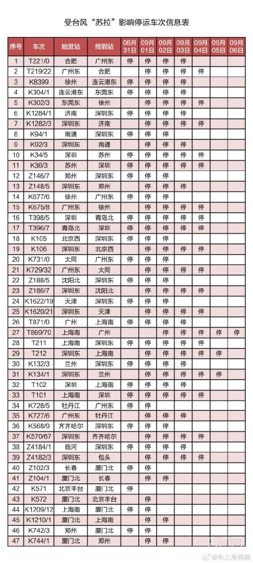 記者從中國(guó)鐵路上海局集團(tuán)有限公司獲悉,受第9號(hào)臺(tái)風(fēng)“蘇拉”影響,為確保列車運(yùn)行安全,鐵路部門(mén)計(jì)劃對(duì)杭深線、京港高鐵、廣深城際、廣深港高鐵、穗深城際、京九線等線路運(yùn)行的部分列車采取停運(yùn)措施。截至30日17時(shí)30分,計(jì)劃停運(yùn)8月31日至9月6日間共121趟旅客列車:其中停運(yùn)動(dòng)車組列車74趟,停運(yùn)普速列車47趟。