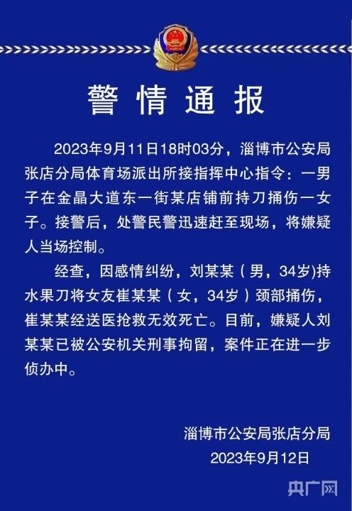央廣網(wǎng)淄博9月12日消息(記者程立龍)9月12日,山東淄博警方發(fā)布通報(bào)稱,一男子當(dāng)街行兇致女友死亡,男子已被公安機(jī)關(guān)刑事拘留。通報(bào)原文如下: