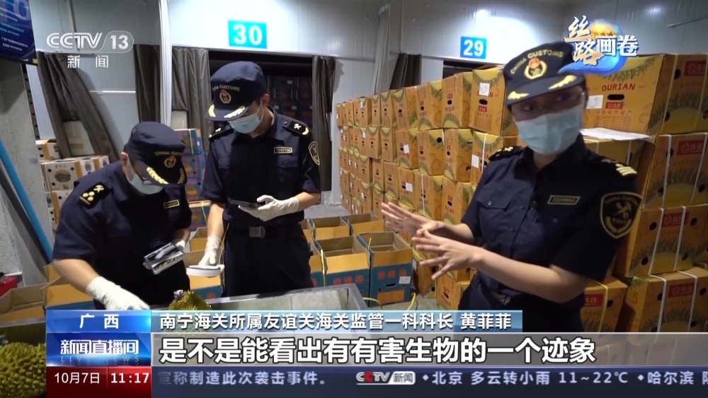 南寧海關(guān)所屬友誼關(guān)海關(guān)監(jiān)管一科科長 黃菲菲:現(xiàn)在他們主要查驗的就是榴蓮的外表面,是不是能看出有有害生物的一個跡象。當(dāng)然他們同時還會對貨證相符性和證證相符性進(jìn)行一個全面的檢查。比如說您看這個就是越南方面開出來的植物檢疫證書,就是為了保證榴蓮又快又好地進(jìn)入國內(nèi)市場,然后讓我們的消費者能夠安心地食用。