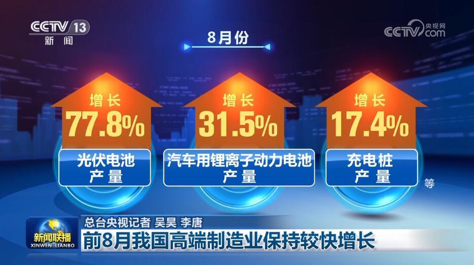 8月份,主要新能源產(chǎn)品兩位數(shù)增長(zhǎng),新能源汽車產(chǎn)量同比增長(zhǎng)13.8%,帶動(dòng)光伏電池、汽車用鋰離子動(dòng)力電池、充電樁等產(chǎn)品產(chǎn)量分別增長(zhǎng)77.8%、31.5%、17.4%;新材料產(chǎn)品生產(chǎn)保持高速增長(zhǎng),太陽(yáng)能工業(yè)用超白玻璃、多晶硅、單晶硅等產(chǎn)品產(chǎn)量分別增長(zhǎng)63.3%、84.6%、79.9%。