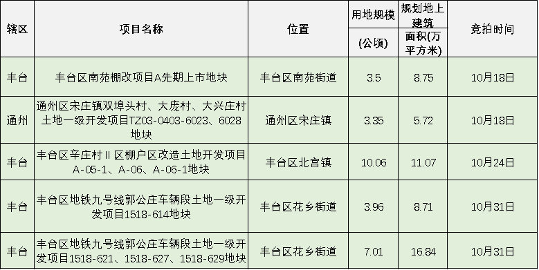 根據(jù)北京市規(guī)自委網(wǎng)站顯示,10月份北京還將有5宗宅地入市,其中豐臺4宗、通州1宗。
