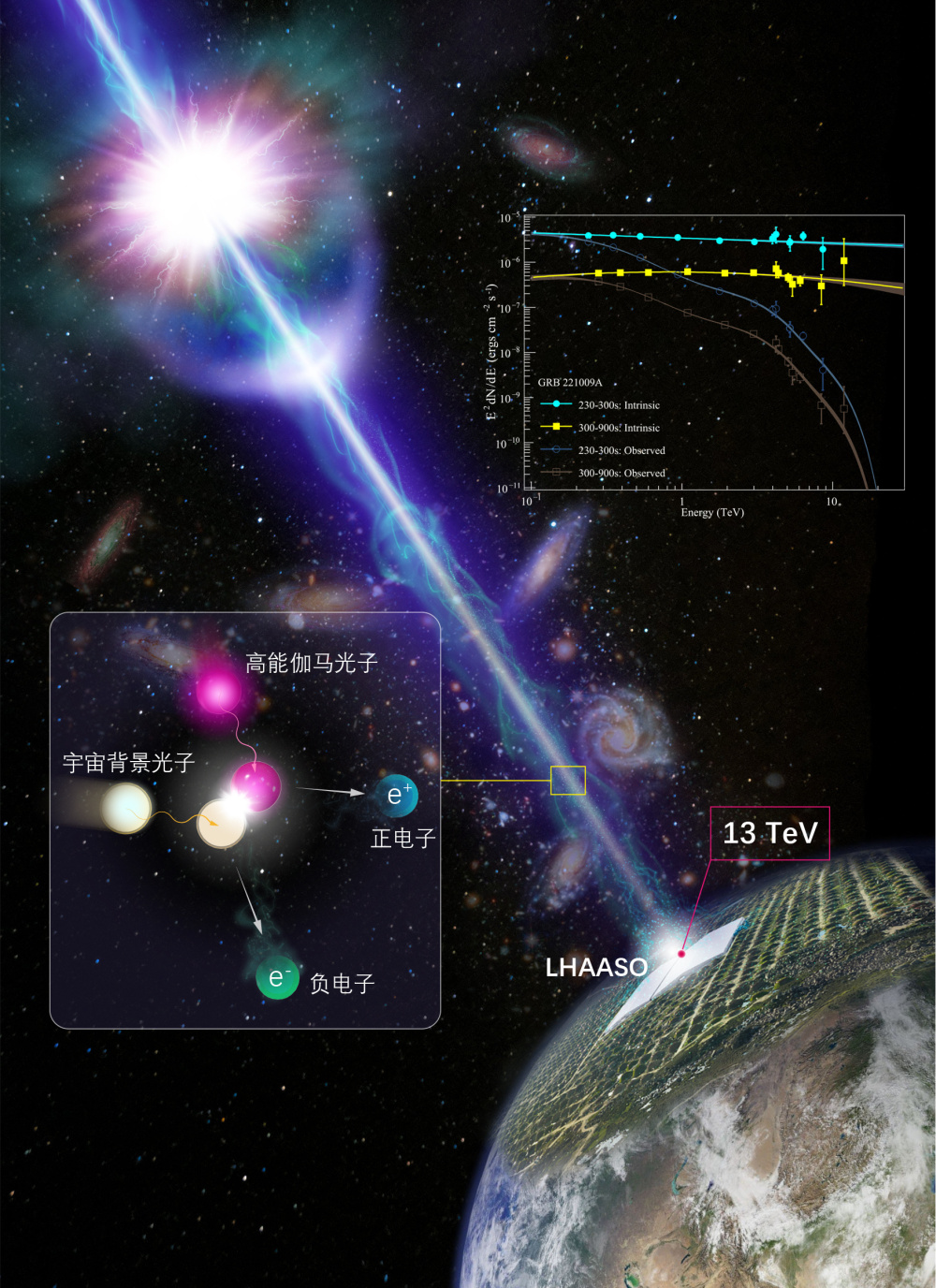 高能伽馬光子在飛行時會被宇宙中彌漫的背景光吸收,伽馬光子能量越高,被吸收得越強烈。反過來,根據伽馬射線被吸收的程度,也可以研究宇宙背景光的強度與性質。GRB 221009A的極高亮度使我們有機會探測到來自24億光年外宇宙深處所產生的高能伽馬光子,這一結果將促使人們重新考慮宇宙中星系的形成和演化過程。