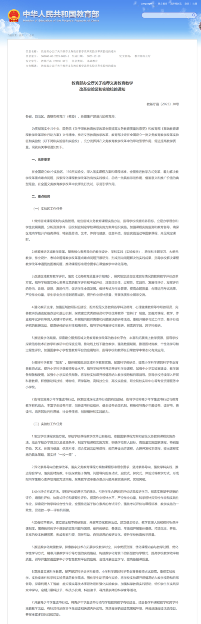 央廣網(wǎng)北京1月8日消息(記者 吳佳怡)近日,教育部辦公廳印發(fā)關(guān)于推薦義務教育教學改革實驗區(qū)和實驗校的通知,決定在全國設立一批義務教育教學改革實驗區(qū)和實驗校,并公示了義務教育教學改革實驗區(qū)和實驗校名單。