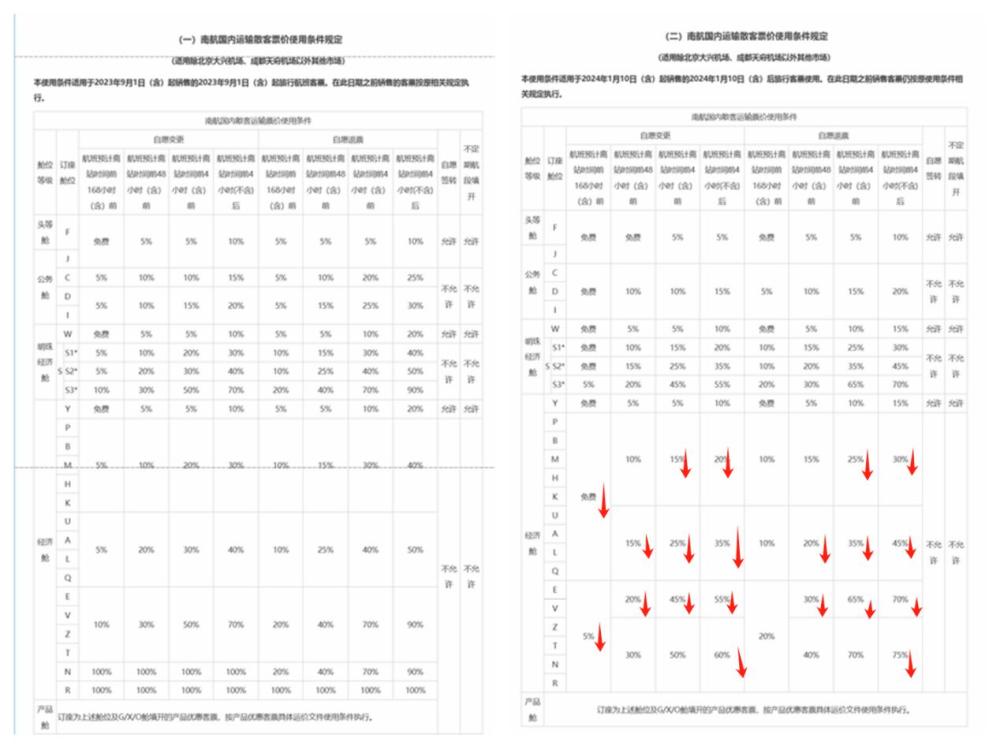 南航退改規(guī)則調(diào)整前后手續(xù)費(fèi)收取標(biāo)準(zhǔn)對比
