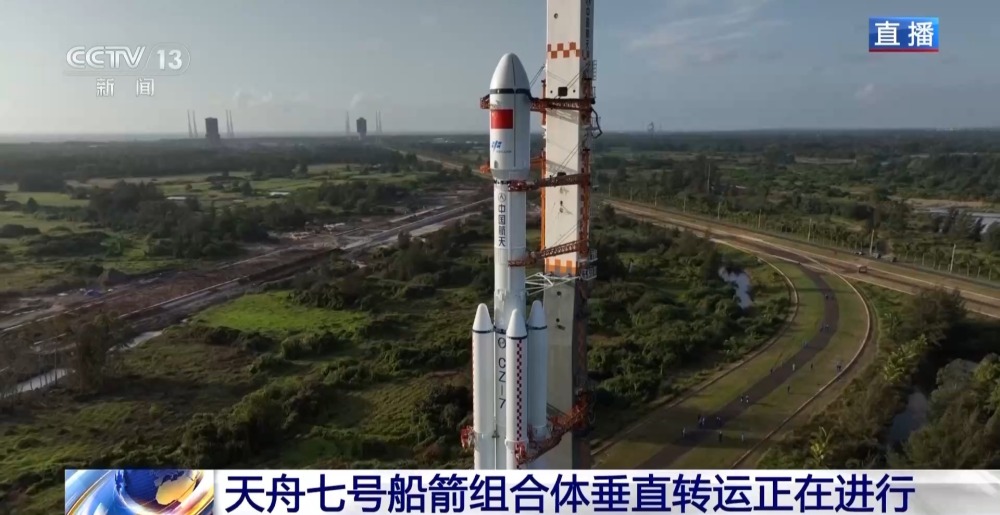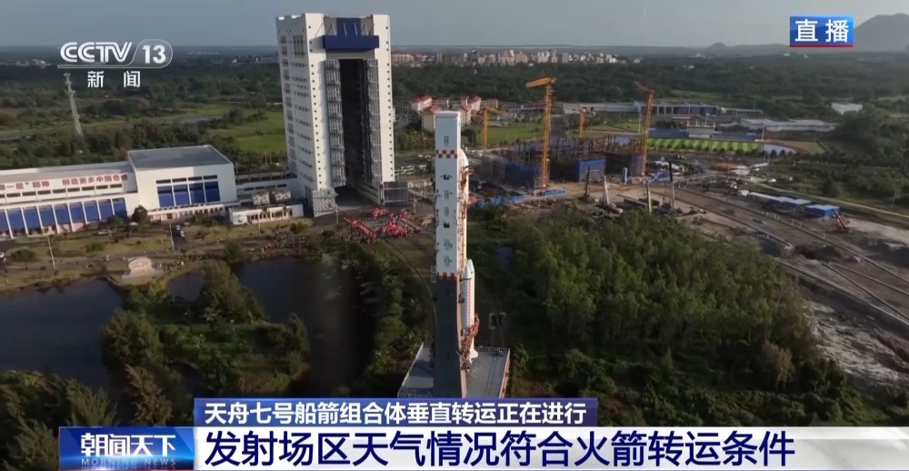 天舟七號船箭組合體垂直轉(zhuǎn)運正在文昌航天發(fā)射場進行