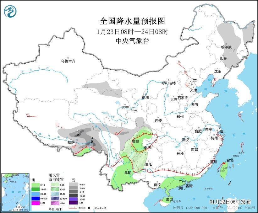 1月23日08時(shí)至24日08時(shí),黑龍江中東部、吉林中東部、西藏南部和東部、青海北部和南部、甘肅河西和南部、川西高原中東部、四川盆地西部、貴州西部、云南東北部等地部分地區(qū)有小雪或雨夾雪,其中,西藏東部局地有中到大雪(5~9毫米)。西藏東南部、四川盆地西部、云南中東部、廣西東部、廣東中南部、海南島中北部、臺(tái)灣島等地部分地區(qū)有小雨。內(nèi)蒙古中部、遼東半島、河北中北部、浙江北部、川西高原北部等地部分地區(qū)有5~6級(jí)風(fēng),渤海、渤海海峽、黃海、東海、臺(tái)灣海峽、臺(tái)灣以東洋面、巴士海峽、南海大部、北部灣等海域有6~7級(jí)風(fēng),陣風(fēng)8~9級(jí)(見(jiàn)圖4)。