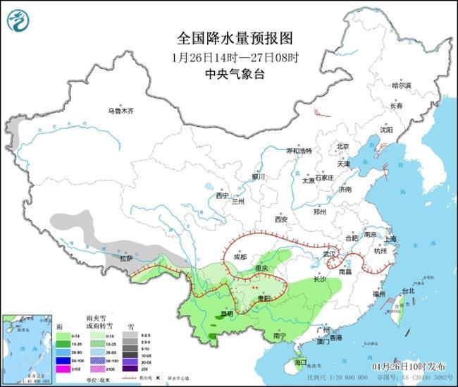 1月25日08時至26日08時,全國大部地區(qū)降水較弱,四川盆地、貴州西部等地部分地區(qū)出現(xiàn)降雨(雪)或雨夾雪;云南部分地區(qū)出現(xiàn)小到中雨,局地大雨;貴州西部部分地區(qū)出現(xiàn)凍雨。今晨,氣溫0℃線位于浙江南部、江西北部、湖北北部一帶。