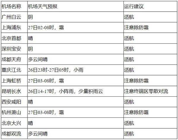 26日中午至27日中午,全國大部機場適航,27日凌晨至早間,哈爾濱、長春、沈陽、青島、南京、合肥、虹橋、浦東、杭州等機場有霜;另外,26日午后,云南中南部航路有分散對流。