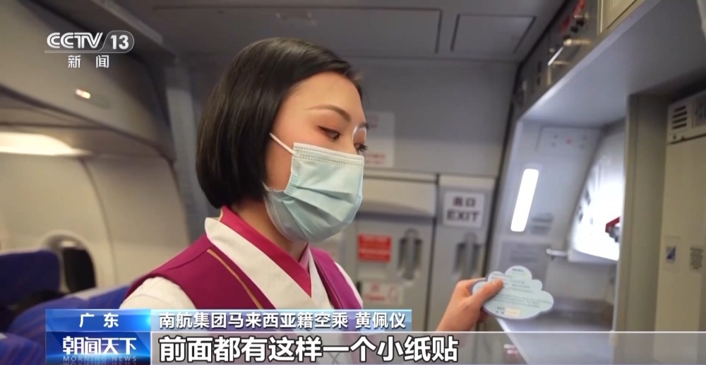 南航集團(tuán)馬來(lái)西亞籍空乘 黃佩儀:現(xiàn)在又到了春運(yùn)的時(shí)期,我們領(lǐng)資料箱的時(shí)候,特地問(wèn)一下能不能多給我們兩包,盡量保證每個(gè)睡覺的旅客,前面都有這樣一個(gè)小紙貼。