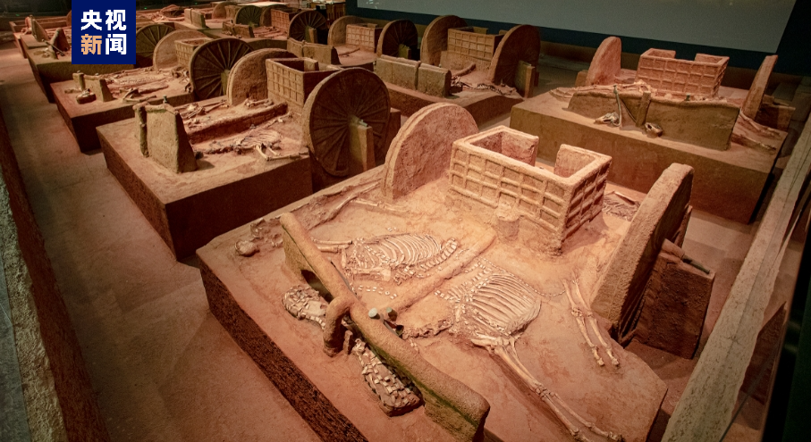 “車轔轔馬蕭蕭”殷墟車馬遺跡展,展廳內(nèi)23座車馬坑遺跡,矩陣式陳列,氣勢(shì)震撼。展示了商代裝飾華麗、結(jié)構(gòu)精巧、機(jī)動(dòng)靈活的馬車,是中國(guó)目前所見最早的馬車實(shí)物標(biāo)本,更是對(duì)三千多年前商文明的生動(dòng)詮釋。經(jīng)過(guò)近百年探索,殷墟發(fā)掘車馬坑九十余座,再現(xiàn)了商代馬車面貌。馬車不僅作為王室貴族的代步工具,也在驛站傳遞、田獵出行、載兵作戰(zhàn)等方面發(fā)揮著重要作用。殷墟馬車多埋于大型墓葬附近或墓道內(nèi)、以車、馬、人合葬居多。殷墟早期以車馬器陪葬,車馬器套數(shù)代表主人所擁有的馬車數(shù)量,見證著主人身份等級(jí)的高低;晚期馬車陪葬成為中、上級(jí)貴族的專屬,彰顯著墓主人的赫赫權(quán)威,亦是馬車陪葬制度的萌芽。