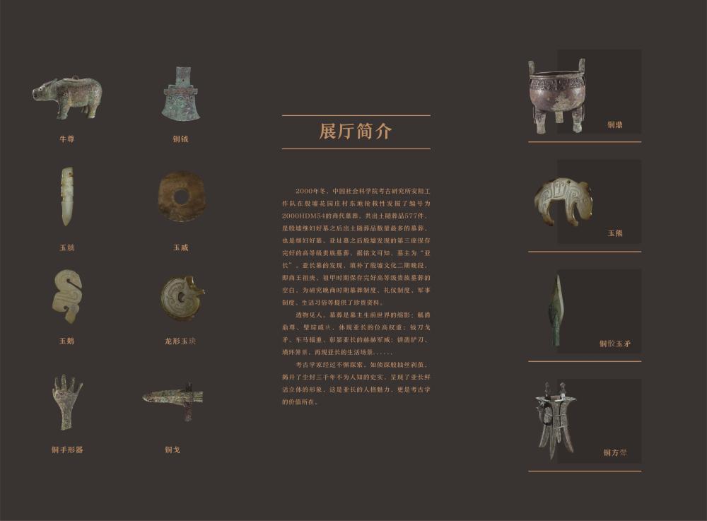 “長(zhǎng)從何來(lái)-殷墟花園莊東地亞長(zhǎng)墓專題展廳”以“亞長(zhǎng)”這位殷商時(shí)期的大將軍為主人公,通過(guò)亞長(zhǎng)墓出土的577件文物,生動(dòng)展現(xiàn)了他的赫赫戰(zhàn)功、排兵布陣、生活起居等場(chǎng)景。亞長(zhǎng)墓是殷墟繼婦好墓之后出土隨葬品數(shù)量最多的墓葬。據(jù)銘文可知,墓主為“亞長(zhǎng)”。透物見人,墓葬是墓主生前世界的縮影:觚爵鼎尊、璧琮戚玦,體現(xiàn)亞長(zhǎng)的位高權(quán)重;鉞刀戈矛、車馬輜重,彰顯亞長(zhǎng)的赫赫軍威;錛鑿鏟刀、璜環(huán)笄觿,再現(xiàn)亞長(zhǎng)的生活場(chǎng)景。考古學(xué)家經(jīng)過(guò)不懈探索,如偵探般抽絲剝繭,揭開了塵封三千年不為人知的史實(shí),呈現(xiàn)了亞長(zhǎng)鮮活立體的形象,這是亞長(zhǎng)的人格魅力,更是考古學(xué)的價(jià)值所在。