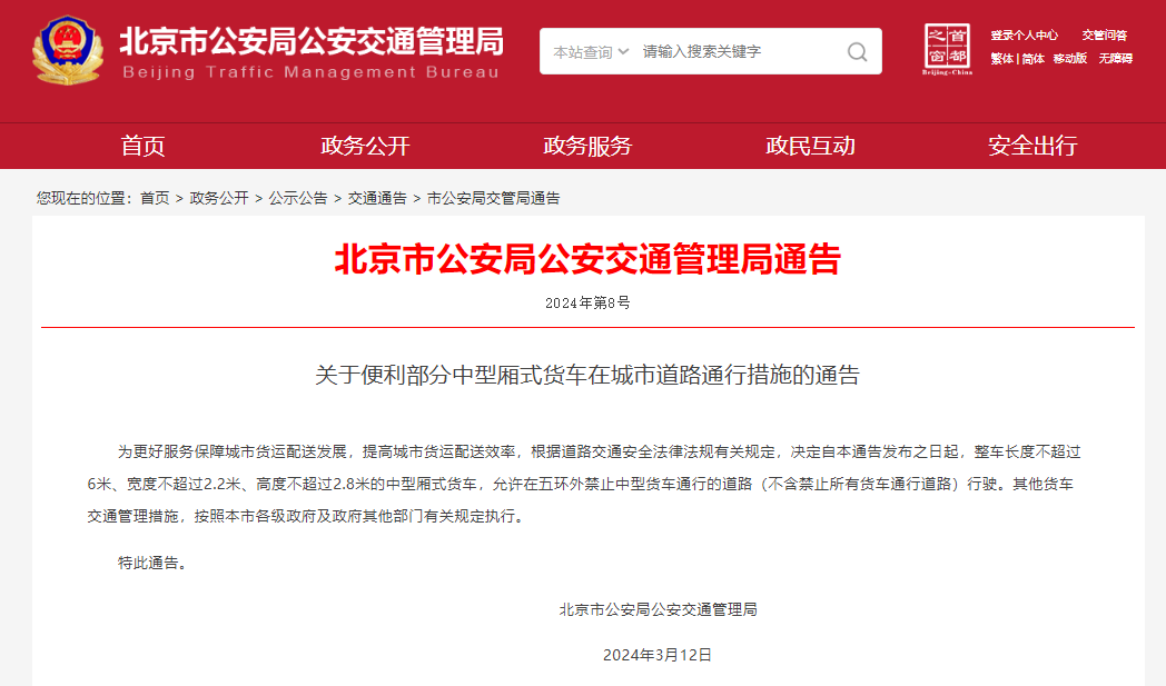 為更好服務(wù)保障城市貨運(yùn)配送發(fā)展,提高城市貨運(yùn)配送效率,根據(jù)道路交通安全法律法規(guī)有關(guān)規(guī)定,決定自本通告發(fā)布之日起,整車長(zhǎng)度不超過6米、寬度不超過2.2米、高度不超過2.8米的中型廂式貨車,允許在五環(huán)外禁止中型貨車通行的道路(不含禁止所有貨車通行道路)行駛。其他貨車交通管理措施,按照本市各級(jí)政府及政府其他部門有關(guān)規(guī)定執(zhí)行。