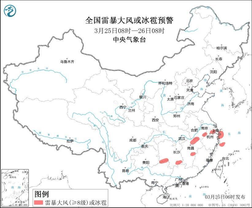 預(yù)計3月25日08時至26日08時,安徽南部、湖南南部、江西中北部、浙江北部、廣西東北部等地的部分地區(qū)將有8—10級雷暴大風(fēng)或冰雹天氣;安徽南部、江蘇南部、上海西南部、湖南南部、江西、浙江中北部和東南部、福建西北部、廣西東北部等地的部分地區(qū)將有短時強降水天氣,最大小時雨量20-40毫米,局地可達(dá)50毫米以上。