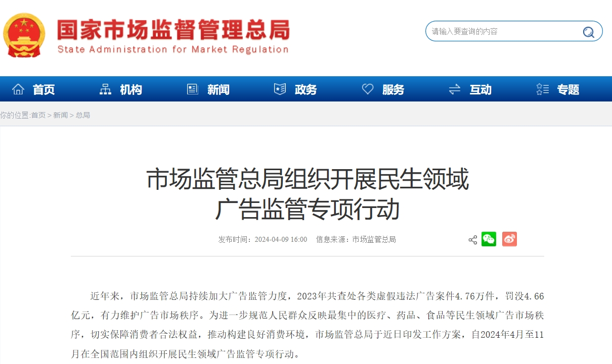 央廣網(wǎng)北京4月9日消息(記者 果君)國家市場監(jiān)督管理總局于近日印發(fā)工作方案,自2024年4月至11月在全國范圍內(nèi)組織開展民生領(lǐng)域廣告監(jiān)管專項行動。