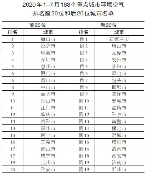 1-7月,168個(gè)重點(diǎn)城市中石家莊、唐山和太原市等城市空氣質(zhì)量相對(duì)較差;???、拉薩、珠海市等城市空氣質(zhì)量相對(duì)較好。