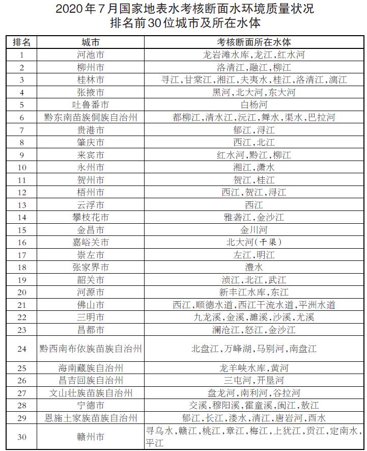 參加排名的全國(guó)地級(jí)及以上城市,覆蓋2050個(gè)國(guó)控?cái)嗝妫ㄆ渲?940個(gè)為國(guó)家地表水考核斷面,110個(gè)為入??刂茢嗝妫?月,全國(guó)地級(jí)及以上城市中,河池、柳州、桂林等30個(gè)城市國(guó)家地表水考核斷面水環(huán)境質(zhì)量相對(duì)較好,滄州、鹽城、連云港等30個(gè)城市國(guó)家地表水考核斷面水環(huán)境質(zhì)量相對(duì)較差;1-7月,全國(guó)地級(jí)及以上城市中,張掖、金昌、柳州等30個(gè)城市國(guó)家地表水考核斷面水環(huán)境質(zhì)量相對(duì)較好,銅川、滄州、邢臺(tái)等30個(gè)城市國(guó)家地表水考核斷面水環(huán)境質(zhì)量相對(duì)較差。
