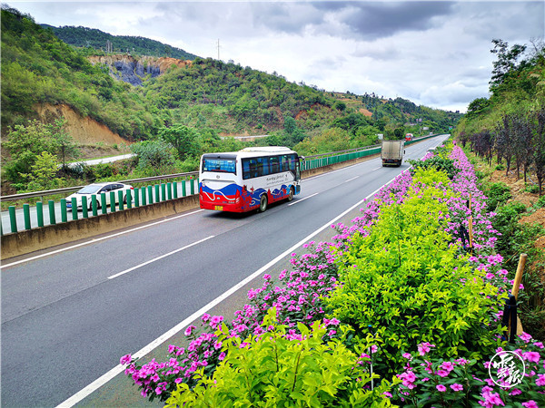 仲夏時(shí)節(jié),昆磨高速普洱至景洪段的羊蹄甲、紫薇、火把花等植物百花齊放,大風(fēng)埡口隧道口姹紫嫣紅的三角梅,寧洱收費(fèi)站立交粉嫩養(yǎng)眼的金絲桃,高速中央隔離帶嬌艷欲滴的木槿,在幾場雨水的洗禮和管理處的精心養(yǎng)護(hù)下,變得生機(jī)盎然。昆磨高速普洱管理處轄區(qū)管養(yǎng)路段植被豐富,公路蜿蜒穿梭在青山綠水間,共設(shè)有5個(gè)立交苗圃基地示范區(qū),以開花喬木為主,地被為輔,四季開花,豐富了植物層次,一立交一風(fēng)景,樹綠花紅的景象與高速公路融為一體交相輝映。