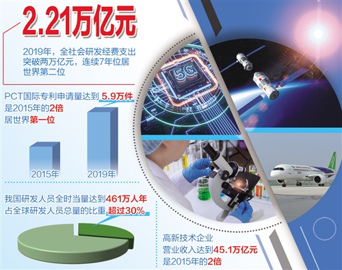科技創(chuàng)新實(shí)力顯著增強(qiáng)。2019年,全社會研發(fā)經(jīng)費(fèi)支出達(dá)到2.21萬億元,是2015年的1.56倍,連續(xù)7年位居世界第二位,占全球研發(fā)經(jīng)費(fèi)總量的比例超過16%。2019年,PCT國際專利申請量達(dá)到5.9萬件,是2015年的2倍,躍居世界第一位。2019年,每萬人有效發(fā)明專利擁有量達(dá)到13.3件,提前完成國家“十三五”規(guī)劃目標(biāo)。