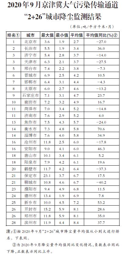生態(tài)環(huán)境部今日向媒體公布了2020年9月京津冀大氣污染傳輸通道“2+26”城市(以下簡(jiǎn)稱“2+26”城市)和汾渭平原11城市降塵監(jiān)測(cè)結(jié)果。