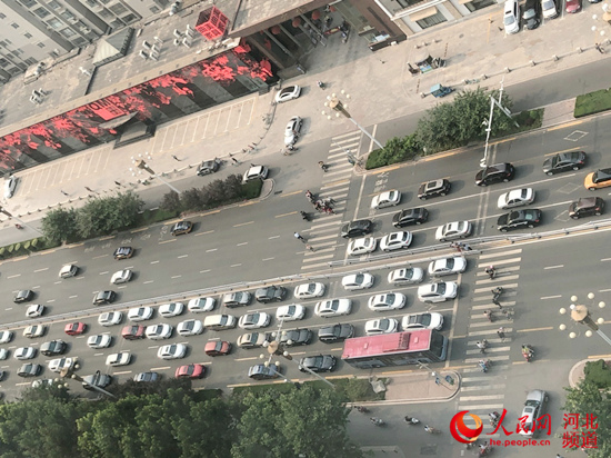 6月12日上午8時(shí)許,正值上班高峰期,石家莊市區(qū)主干道裕華路上,人多車多。裕華路與體育大街交口往東,北側(cè)是劍橋春雨小區(qū),南側(cè)是方北小區(qū),兩個(gè)小區(qū)門(mén)口正對(duì)裕華路的半幅機(jī)動(dòng)車道上分別畫(huà)著斑馬線。因?yàn)楦浇袑W(xué)校,南北兩側(cè)陸陸續(xù)續(xù)有送孩子的家長(zhǎng)或騎車人從斑馬線通過(guò)裕華路。每當(dāng)有人通過(guò)斑馬線時(shí),裕華路上的汽車都會(huì)停下來(lái)等候。由于行人三五成群,不斷通過(guò),路上的汽車不得不繼續(xù)等候,以至于排起了長(zhǎng)龍。