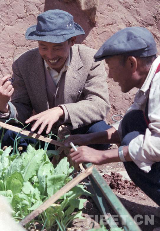 這是時(shí)任雙湖辦事處(現(xiàn)雙湖縣)紀(jì)律檢查委員會書記的熊亮兵(左),正在觀察自己在家門口通過搭塑料薄膜小篷試種的蔬菜(唐召明1987年攝)