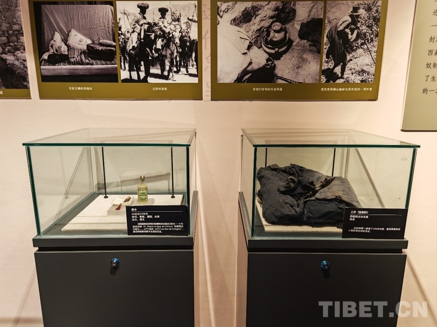 圖為舊西藏貴族使用的香水瓶與西藏民主改革前農(nóng)奴穿著的破舊衣物的對(duì)比展覽圖 供圖:民族文化宮