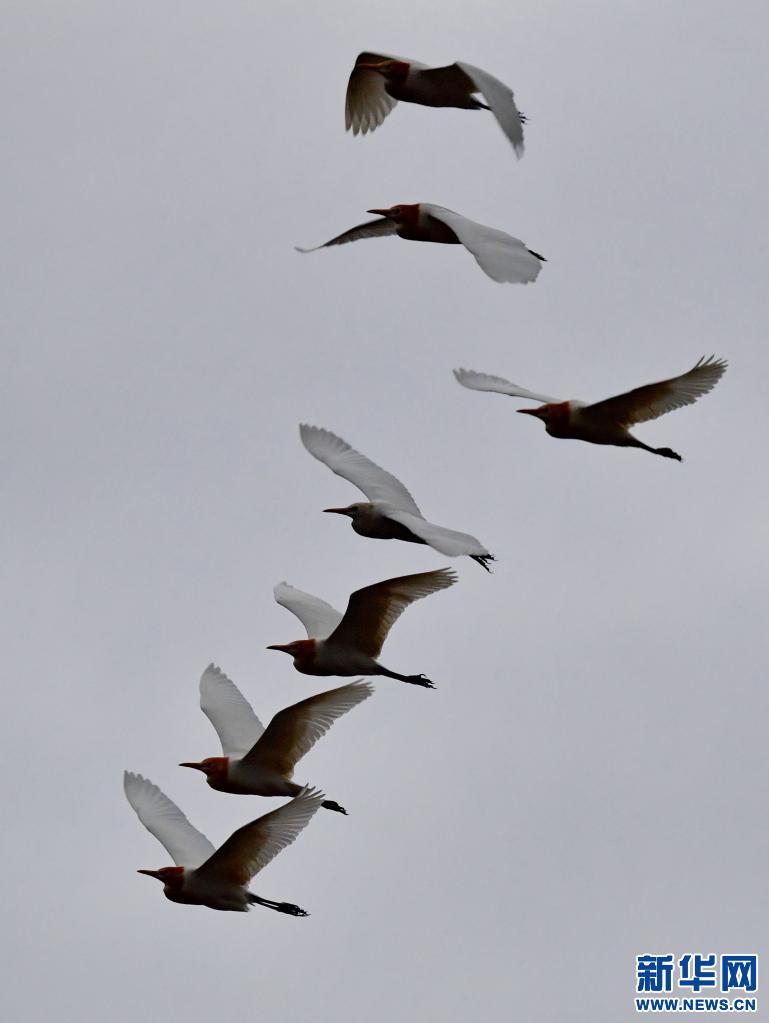 牛背鷺在易貢國(guó)家地質(zhì)公園上空飛翔(5月22日攝)。新華社記者 張汝鋒 攝