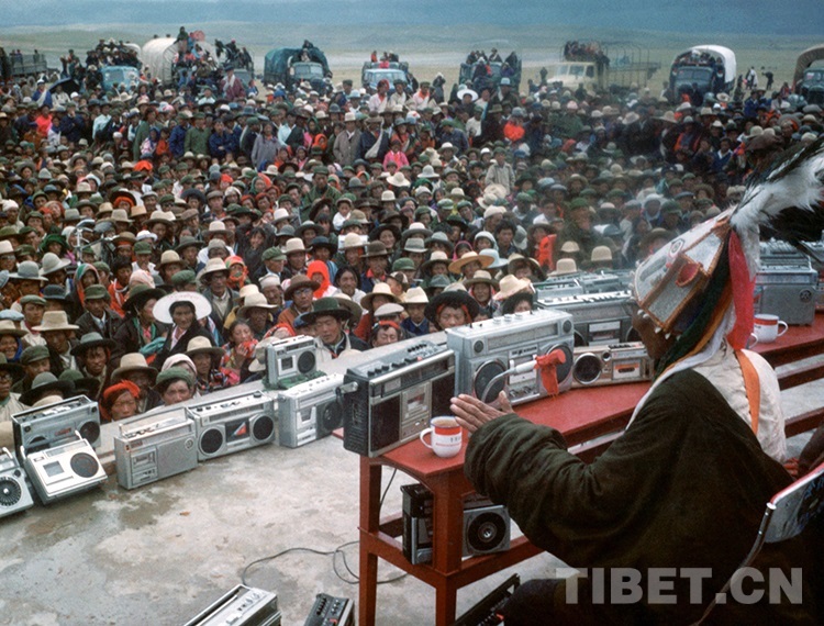 圖為說唱藝人阿達(dá)在西藏那曲賽馬會上說唱《格薩爾》的傳奇故事,臺上擺滿了牧民群眾的各式錄音機(jī)(才龍1985年前后攝)