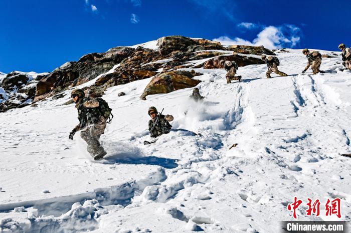 巡邏途中,官兵們順雪坡滑下,節(jié)省時間?!⊥踅?攝
