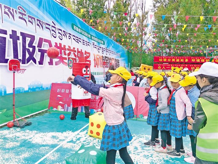 在拉薩市城關(guān)區(qū)組織開展的“不忘初心、牢記使命”主題教育暨“垃圾分類黨員先行 守護(hù)凈土人人有責(zé)”活動現(xiàn)場,學(xué)生代表參加趣味游戲。