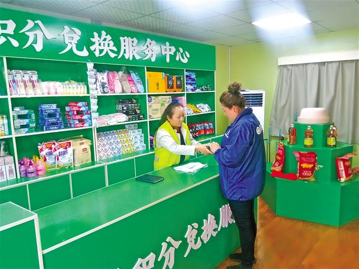 城關(guān)區(qū)嘎瑪貢桑街道辦事處統(tǒng)建社區(qū)居民在垃圾分類積分兌換超市兌換生活用品。