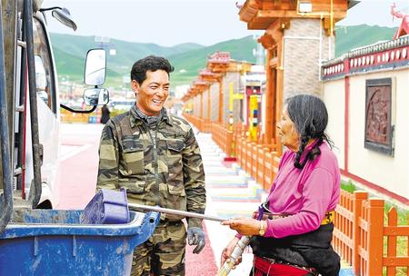 卓瑪加開著垃圾轉(zhuǎn)運(yùn)車挨家挨戶收運(yùn)垃圾。