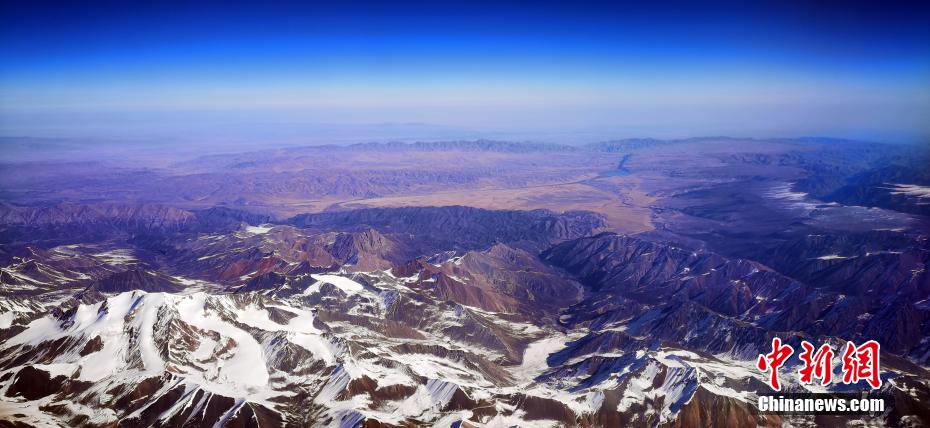 11月9日,記者從萬米高空俯瞰祁連山,雪域之巔造型各異,氣勢(shì)恢宏的雪山棱角分明,在皚皚白雪的覆蓋下,山巔似撒了一把把“椒鹽”,陽剛與陰柔之美相得益彰,高原湖泊如藍(lán)寶石般鑲嵌在祁連山脈,更有藍(lán)天、白雪、黃沙和諧同框的奇觀,宛如張張“水墨丹青”的油彩畫,看“醉”空中旅人。 魏建軍 攝