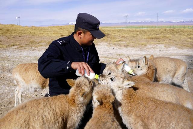 12月7日,在給藏羚羊幼仔喂奶前,可可西里索南達(dá)杰保護(hù)站站長(zhǎng)趙新錄(中)用嘴測(cè)試奶溫。