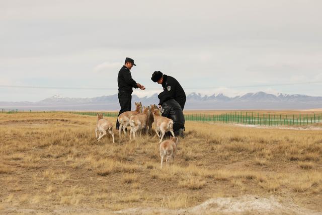 12月7日,可可西里巡山隊(duì)員和藏羚羊幼仔在一起。