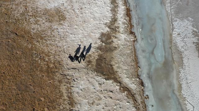 12月7日,站長(zhǎng)趙新錄(中)與隊(duì)友鄧海平(左)、達(dá)才在可可西里索南達(dá)杰保護(hù)站管護(hù)區(qū)域內(nèi)巡查(無(wú)人機(jī)照片)。