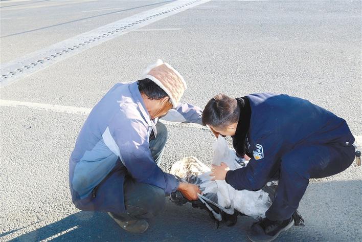 民警迅速到達現場了解得知:報案人普某路過年楚河大橋時發(fā)現一只飛行中的鳥撞到電線后落地,導致其右側翅膀受傷,無法正常飛行,遂報警求助。經過仔細觀察,民警懷疑該鳥為國家一級保護動物——黑頂鶴,于是在上報指揮中心的同時,與桑珠孜區(qū)林業(yè)局取得聯(lián)系。