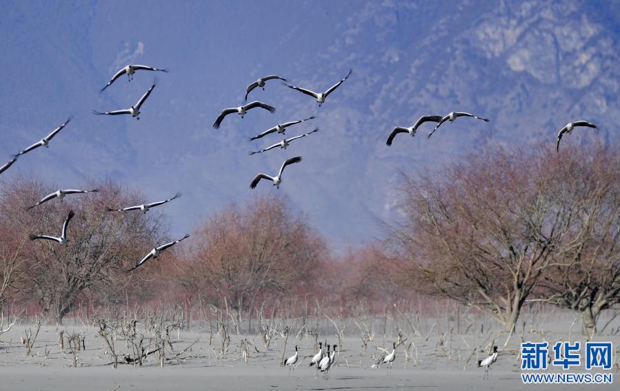 冬季,成群結(jié)隊(duì)的黑頸鶴遷徙到西藏林芝市,雅魯藏布江及江畔的農(nóng)田成了它們?cè)蕉臉?lè)園。