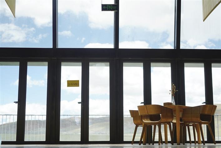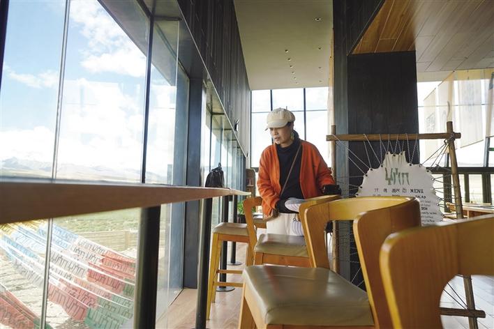 從正門進入,穿過牦牛文化空間走廊,便可到能夠以最佳視角欣賞念青唐古拉山的VR觀景臺。緊鄰觀景臺右側(cè),是一間擺放當(dāng)?shù)匚膭?chuàng)產(chǎn)品、各類書籍的觀景咖啡廳。該咖啡廳的兩面墻體設(shè)計為超大落地窗,在此休息的游客可以邊品嘗咖啡,邊欣賞念青唐古拉山及拉多草原的美景。走進咖啡廳,記者看到不少在這里休息的游客都在低頭寫著什么,經(jīng)咖啡廳負責(zé)人介紹:“這些游客是在寫明信片,我們這里不僅提供餐飲,還提供印有本地風(fēng)景的明信片,并同中國郵政合作,幫助游客按時將明信片寄到他們的親朋好友手中,讓游客們的旅途變得更有意義。”