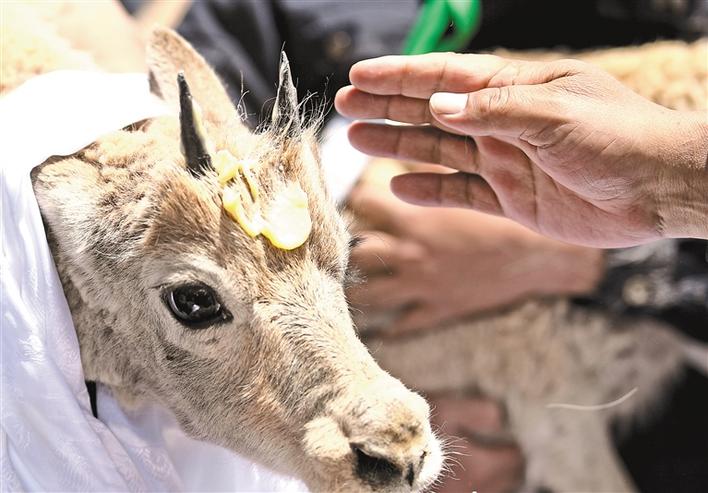 7月7日,在可可西里索南達(dá)杰保護(hù)站野生動(dòng)物救助中心,三公兩母共五只人工救助的藏羚羊被放歸大自然。圖為7月7日,在可可西里索南達(dá)杰保護(hù)站野生動(dòng)物救助中心,可可西里巡山隊(duì)員按照風(fēng)俗,在藏羚羊額頭上涂抹酥油表達(dá)祝福。[詳細(xì)]