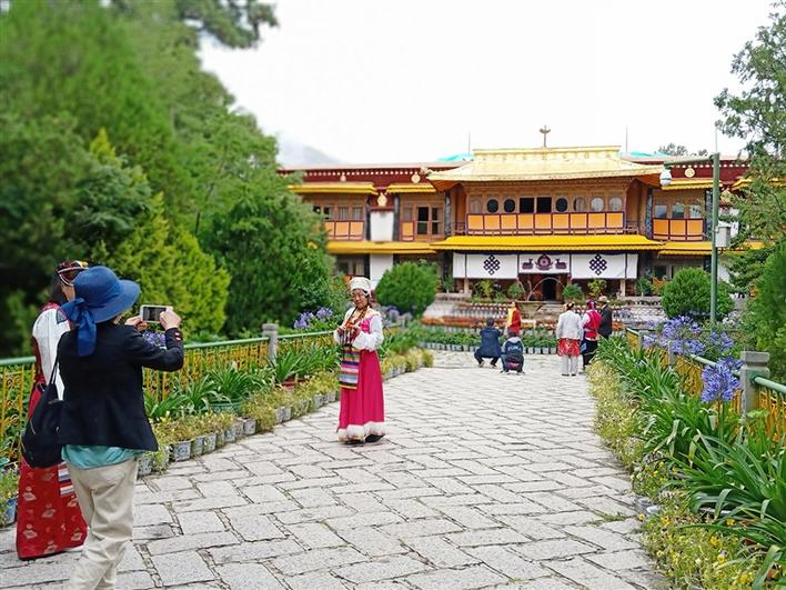 羅布林卡內(nèi)一步一景,每一處都能發(fā)現(xiàn)各類品種的花卉,在達(dá)旦明久頗章前面的水池內(nèi),幾朵睡蓮在雨水的滋養(yǎng)下盡情舒展開來。宮殿內(nèi)、石板路邊擺放的一盆盆盛開的鮮花,像是臉上堆滿了笑容的少女。人們對于優(yōu)美的風(fēng)景總是毫無抵抗力,紛紛拿起手中的相機(jī)、手機(jī)拍照留念,讓美好瞬間定格于此。連一旁休憩的老奶奶都情不自禁地想幫路人拍照。