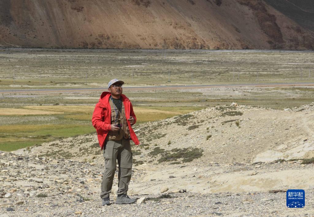 8月30日,在西藏日喀則市定日縣,中科院地理科學與資源研究所客座教授李渝生使用放大鏡觀察巖石。新華社記者 杜剛 攝