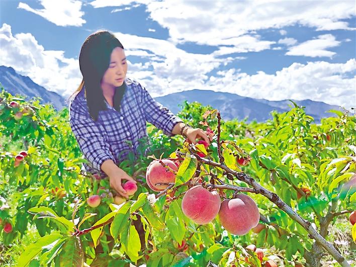 還未走進桃園,桃子特有的清甜香味便撲鼻而來。當?shù)毓ぷ魅藛T告訴記者,快熟了的桃子半青半紅,吃起來很美味。在他的指引下,記者摘下一顆白中透粉的桃子,這種已經熟透的桃子,桃肉松軟,咬一口,清香又甜蜜的汁水就一涌而出,瞬間征服味蕾。