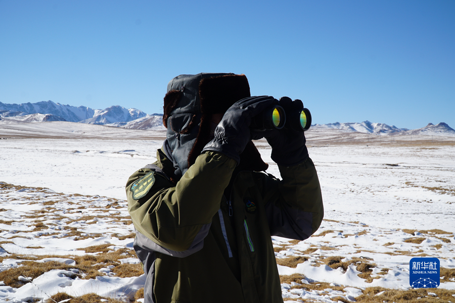 12月3日,祁連山國家公園沙龍灘管護站生態(tài)管護員楊有財用望遠鏡觀測。新華社記者 耿輝凰 攝