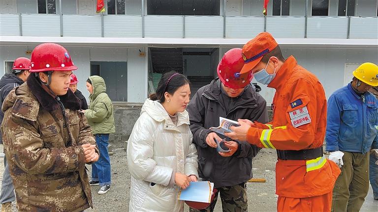 圖為消防員在為施工單位工作人員宣傳防火知識。 記者 張猛 王珊 攝